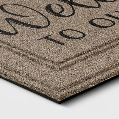This Welcome To Our Home tan door mat is the perfect mat for any entryway. The tightly woven textile surface is on a durable recycled rubber base and offers a lasting upscale look. The flat woven construction is designed to clear in-swinging entry doors. This water absorbent carpet keeps moisture and dirt away from indoor floors. The woven polyester surface is easier to clean than traditional carpet mats. Made in the USA.