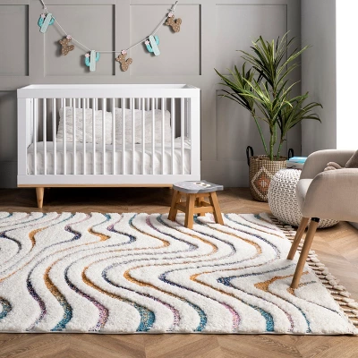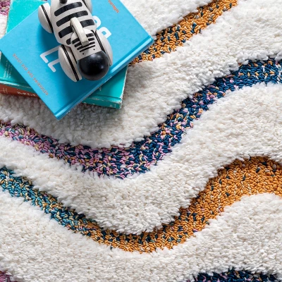 Both children and adults alike are bound to fall in love with this beautiful cozy textured area rug. Not lacking a single detail this rug features a fun creative pattern, bright pops of color, and braided tassels. It will make the perfect addition to a playroom, nursery, or bedroom. Prized for their durability and ease of care, synthetic rugs are the perfect choice when spills and constant foot traffic are at the top of your mind.