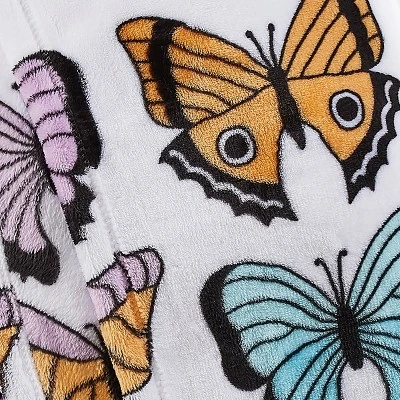 Bring positive energy and beauty to your home with this colorful butterfly throw from Jessica Simpson. Butterflies in vivid shades of purple, aqua and gold are printed on high-quality polyester plush for exceptional softness. Not only is this throw an aesthetic piece, but it will bring warmth and coziness to any room. Generously sized at 50×70”, it is perfect for both kids and adults! Machine washable for easy care.