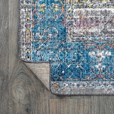 Based on a vintage medallion rug design, Anatolia mixes peacock blue and shades of gray for a modern color palette. A central medallion in peacock blue sits on a mingled gray background. An ornate border in peacock blue accented with mustard yellow completes the design. Varying shades of color create a worn, vintage look.