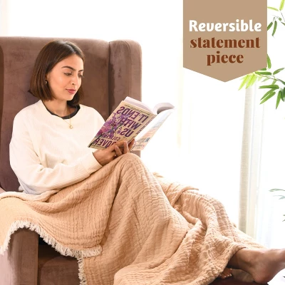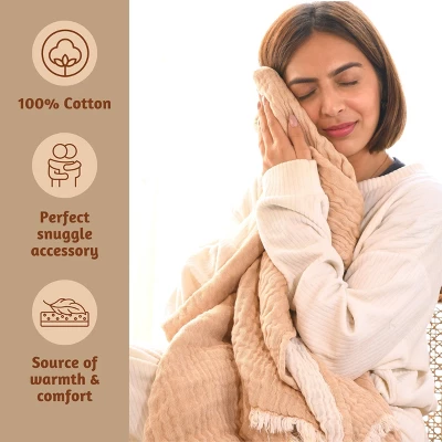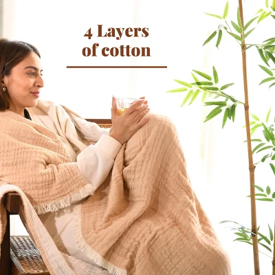 Experience ultimate comfort, style, and versatility with our plush throw blanket. Elevate your snuggling experience with these carefully crafted blankets, designed to bring warmth and charm to your space.Premium Material – Made from 100% breathable cotton, this blanket is crafted with a 4-layer gauze material, ensuring the perfect snuggling experience on your couch. Add a touch of charm to your décor with these lightweight throw blankets.Reversible: Two Colors – Indulge in luxurious comfort with our premium blankets. Measuring 50 x 60 inches, it enhances your sleep experience. These throws are also reversible, ensuring you can effortlessly switch up your decor while enjoying the sumptuous feel of our high-quality fabrics. Exceptional Gift Choice – Make any occasion special with our throws for couches. Whether it’s a housewarming, anniversary, birthday, or festive celebration like Christmas or Diwali, these throws are the ideal gift choice.Care Instructions – Machine Wash – Maintaining the quality of these couch blankets and throws for the living room is easy. Simply machine wash them on a gentle cycle using warm water. For optimal care, avoid using bleach, tumble dry on low, or iron on a warm setting. Handwashing is also a suitable option.