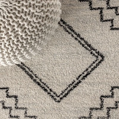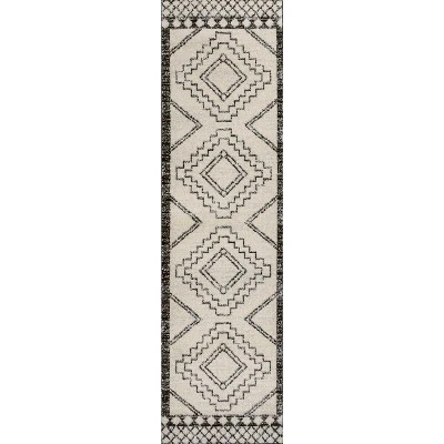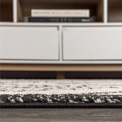 Moroccan influences abound in the geometric design of this rug. Shades charcoal black create a lively medallion design against a deep ivory background. Add graphic impact to a modern room, or make this rug part of your Boho-chic story.