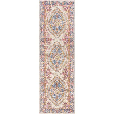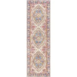 Featuring a floral central medallion and a rich Bohemian color scheme, this beautifully patterned rug adds a vintage vibe to your living room, bedroom, or den. The deep blue and raspberry scheme on a gray and ivory ground has a timeworn, faded effect. Power loomed for durability and constructed in polypropylene for longevity, this stunning piece is made to last.