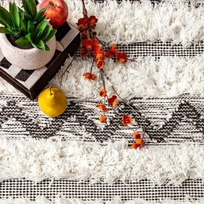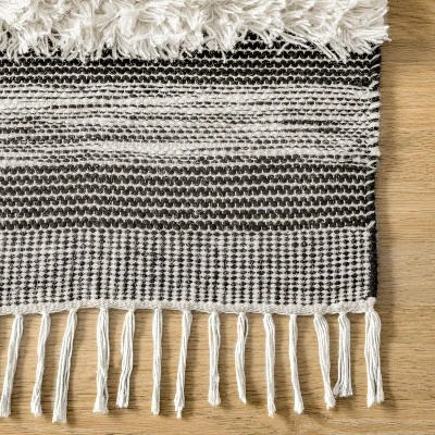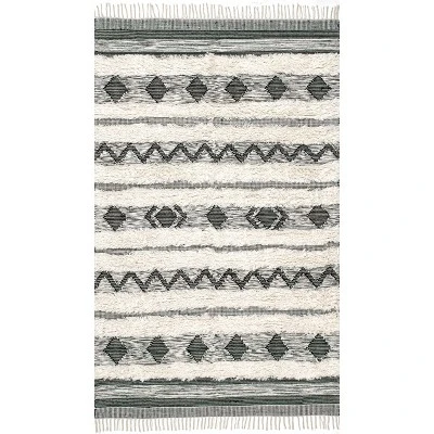 Adorn your floor with texture and patterns with the nuLOOM Nylah area rug. Shaggy strips alternate with tight-woven designs to create a fun room accent that commands attention and becomes a focal point. Diamonds, lines, and angles add visual interest to this casual piece, and the hand-woven 100 percent wool construction provides durability to resist everyday wear and tear. End tassels emphasize the eclectic look of this rug which is perfect for giving your living area or bedroom space a relaxed and inviting vibe.