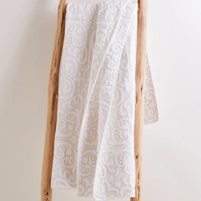 The Sherbourne Taupe Stitch Reversible Quilted Throw by Levtex Home is inspired by antique European inspired wall coverings and tapestries. This white with taupe stitch cotton in an intricate medallion pattern design will immediately transform your bedroom. Made with the softest lightweight cotton, this reversible throw features a white with taupe stitch medallion pattern, reversing to a white with taupe stitching on the other. The Quilted Throw is perfectly sized at 50x60in. and is machine washable. Enjoy this for years to come!